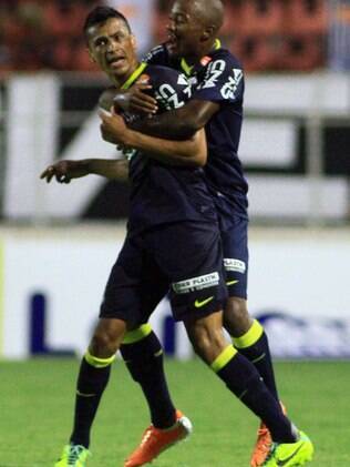 Cícegol (à esq.) comemorando junto com Vicotr Andrade (dir.) o gol salvador. |